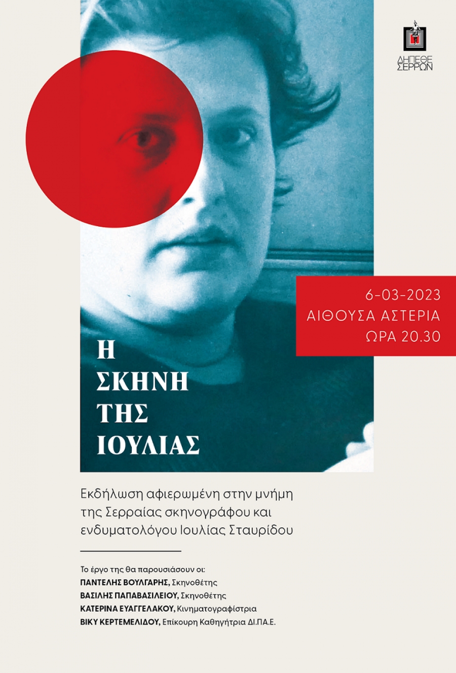 Το ΔΗ.ΠΕ.ΘΕ Σερρών τιμώντας την μνήμη της σπουδαίας Σερραίας σκηνογράφου και ενδυματολόγου του θεάτρου και του κινηματογράφου Ιουλίας Σταυρίδου, πήρε την απόφαση να δοθεί τιμητικά το όνομα της στην Μικρή σκηνή του Δημοτικού Θεάτρου «ΑΣΤΕΡΙΑ». Στο πλαίσιο αυτό διοργανώνει εκδήλωση στην οποία θα παραστούν και θα μιλήσουν για την ζωή και το έργο της σημαντικά και καταξιωμένα πρόσωπα από τον καλλιτεχνικό χώρο που συνεργάστηκαν μαζί της, όπως οι: