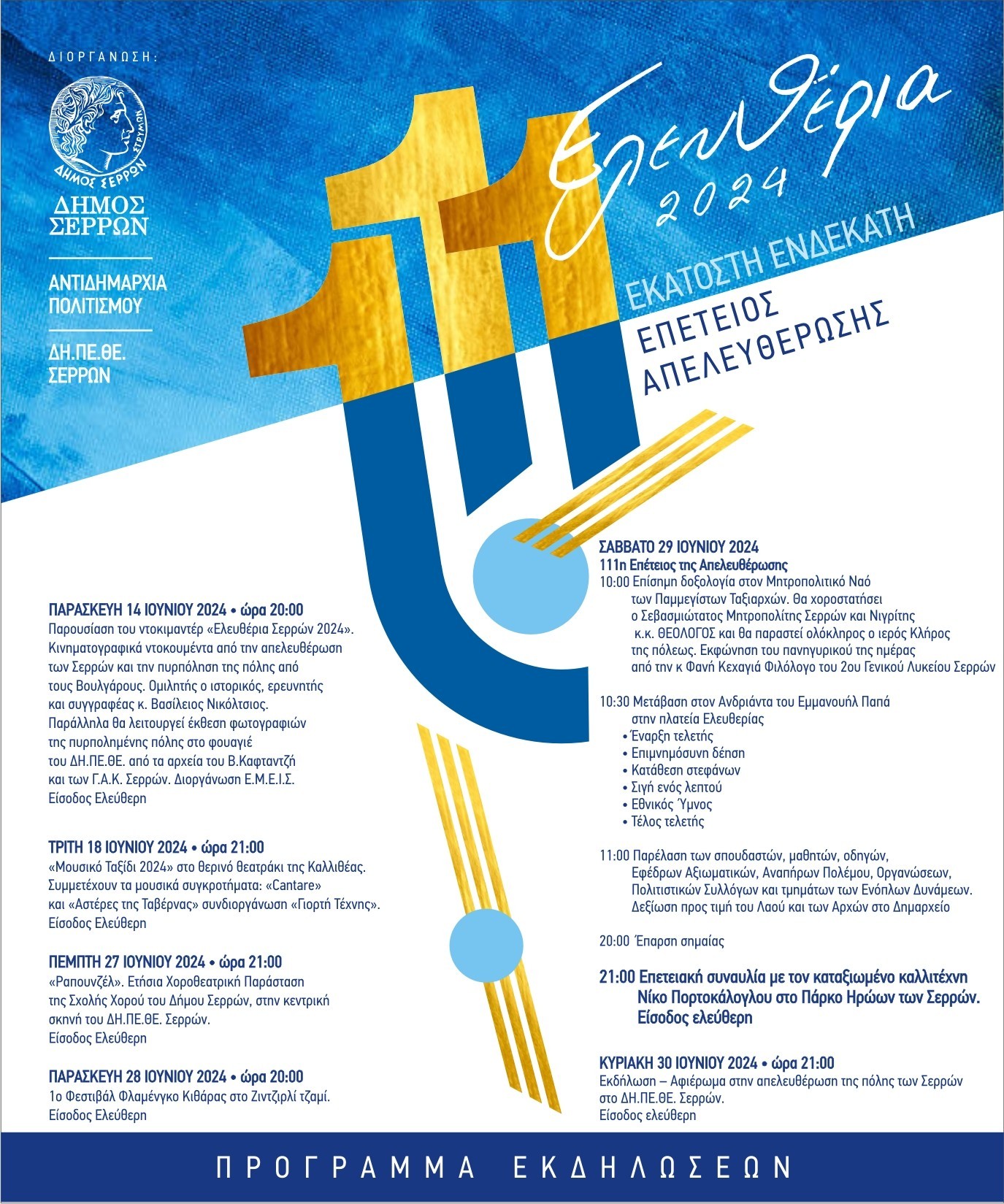 Την 111η Επετείου της Απελευθέρωσης των Σερρών θα γιορτάσει με λαμπρότητα και εφέτος ο Δήμος Σερρών με μία σειρά δράσεων που θα ξεκινήσουν από την Παρασκευή 14 Ιουνίου 2024 και θα κορυφωθούν με την εκδήλωση-αφιέρωμα στην Απελευθέρωση της πόλης, στο ΔΗΠΕΘΕ Σερρών την Κυριακή 30 Ιουνίου. .