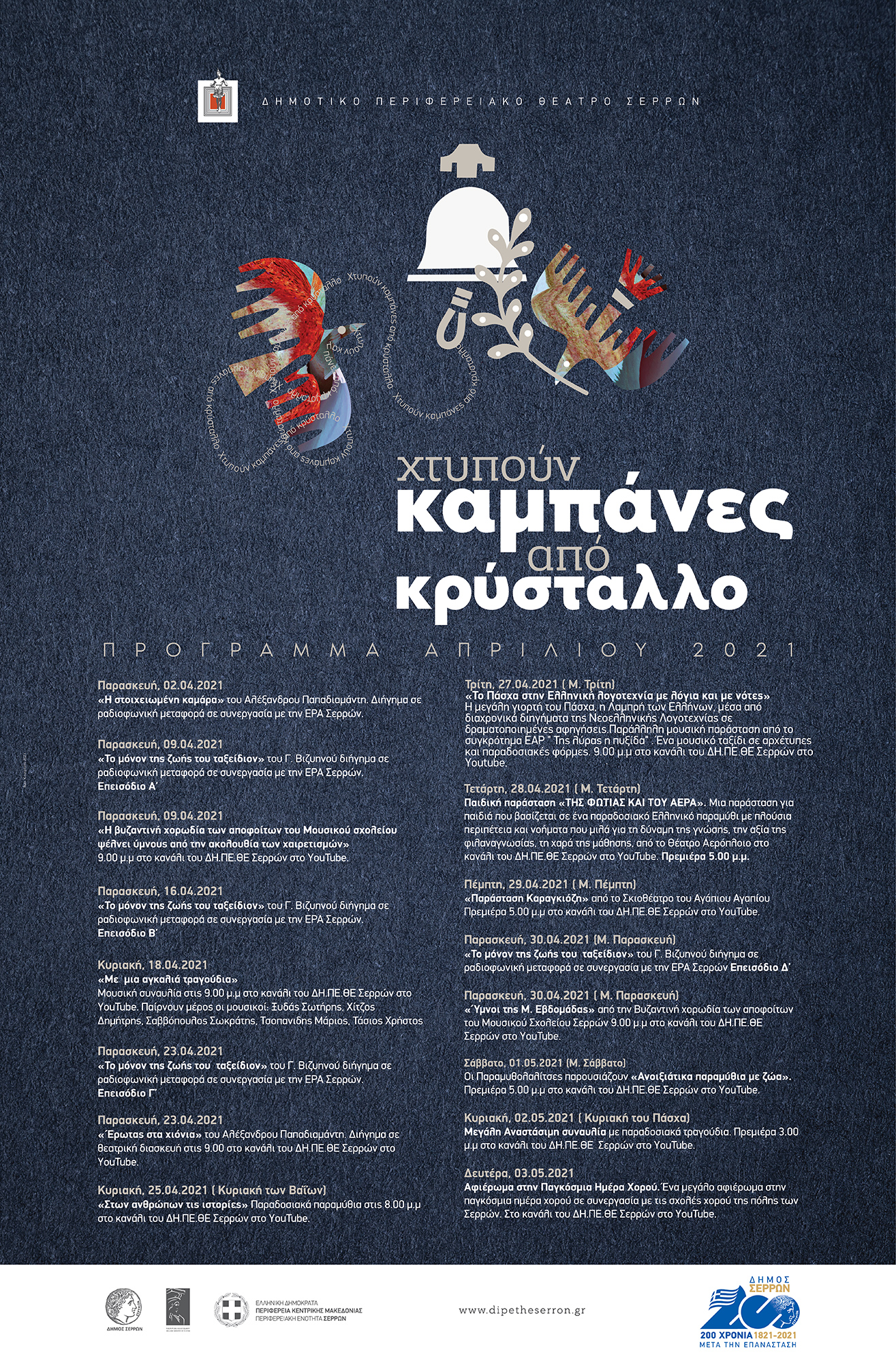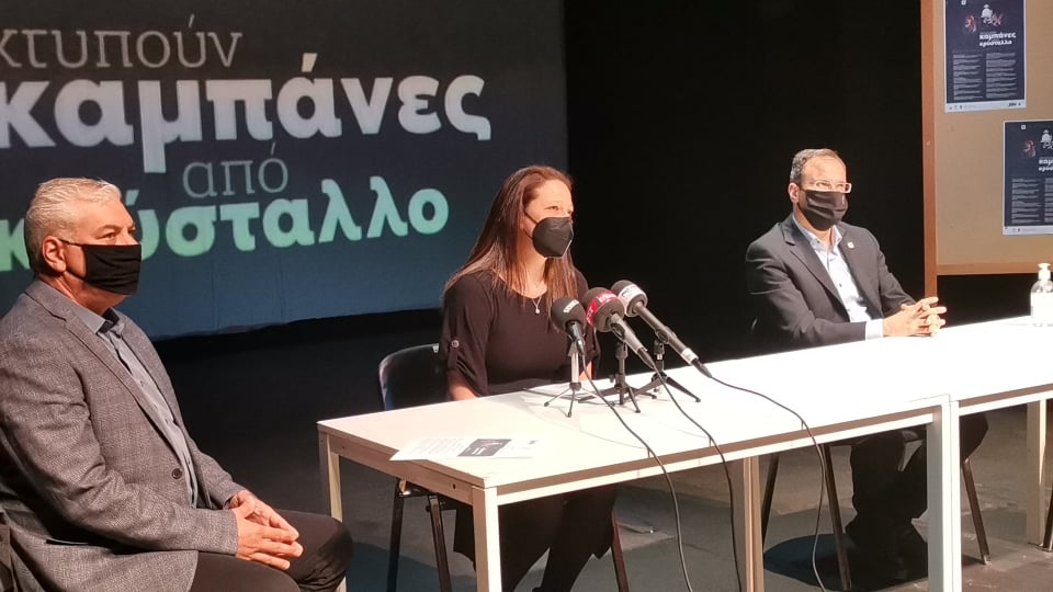 Συνέντευξη Τύπου παραχώρησαν σήμερα Δευτέρα 12/4/21 ο Δήμαρχος Σερραίων κ. Αλέξανδρος Χρυσάφης, ο Πρόεδρος του ΔΗ.ΠΕ.ΘΕ. Σερρών κ. Ιωάννης Γάτσιος και η Υπεύθυνη Καλλιτεχνικού προγράμματος/ σκηνοθέτης κ. Καλλιόπη Ευαγγελίδου, παρουσιάζοντας ενόψει του Πάσχα ένα πλούσιο καλλιτεχνικό πρόγραμμα με τίτλο « Χτυπούν Καμπάνες από Κρύσταλλο»
